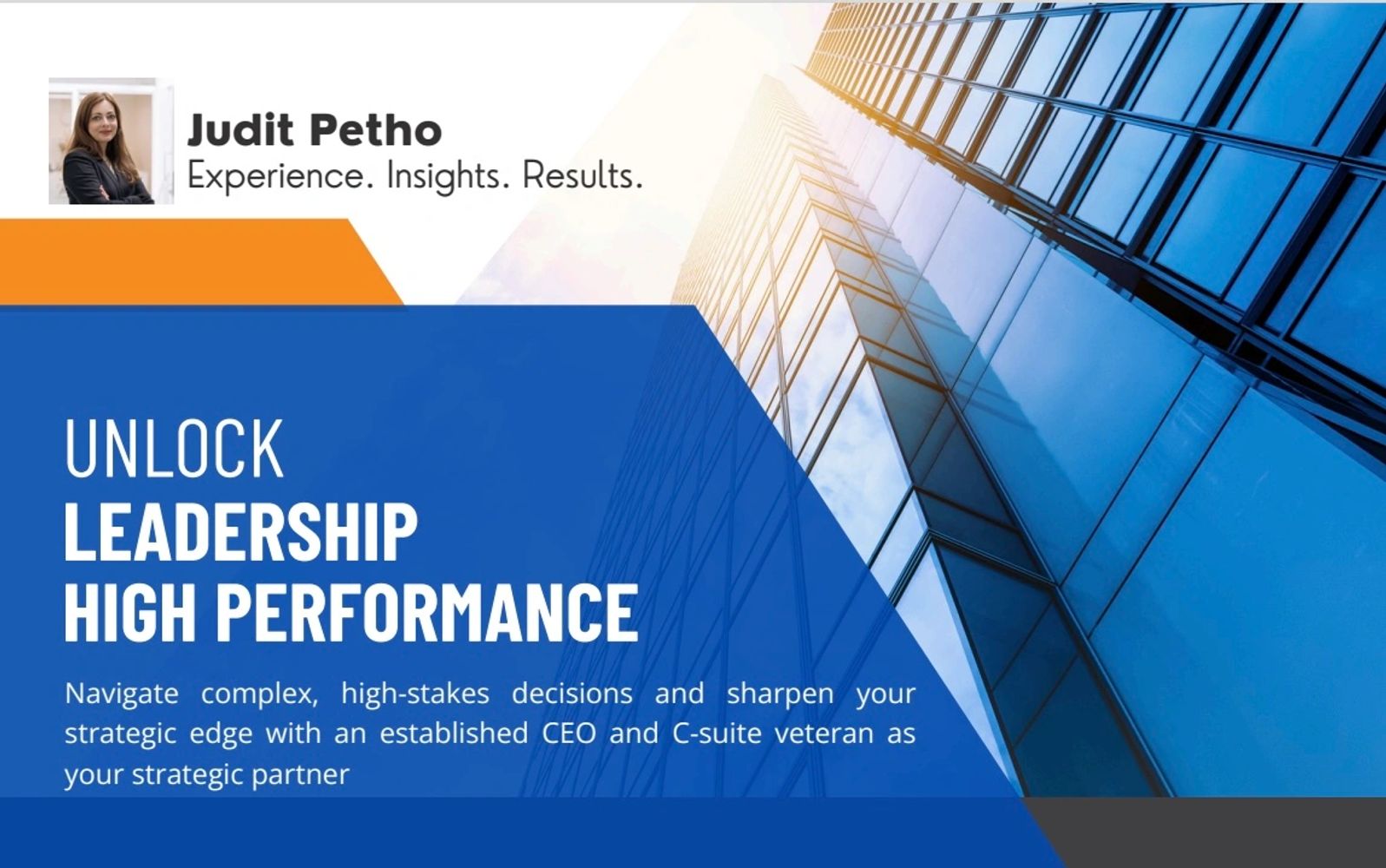 My name is Judit Petho and I am an advisor, sounding board, change maker, and confidant to senior executives on issues that impact their performance and the success of their business. I provide high-level business expertise to drive high performance, growth or transformation.